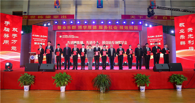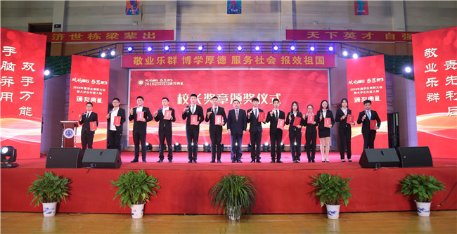党委书记吴学敏为获得黄炎培特别奖学金、校长奖章的同学颁奖,他与获奖同学一一握手,为他们佩戴校长奖章并颁发证书。党委副书记苏小冬,纪委书记于林惠,副校长霍雄飞、朱建国等校领导为国家奖学金、江苏省三好学生、江苏省优秀学生干部等省级以上奖项以及学校先进集体、先进个人、黄炎培专项奖学金获得者代表颁奖。