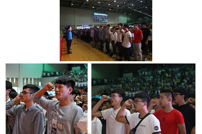 新生入学誓词宣读过程中,全场新生齐声朗诵“我愿以青春年华,传承百年薪火;手脑并用,双手万能;敬业乐群,责先利后;弘扬工匠精神,锤炼技术技能;提升人格境界,增进智慧学养;珍惜美好岁月,铸就身心健康;今日我以南工院为荣,明日我为南工院荣光!”。铿锵有力的声音响彻校园,表达出同学们挑战未来的雄心壮志!