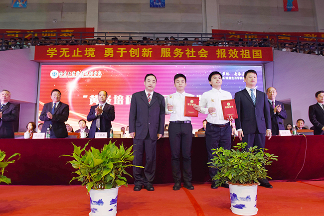 党委书记吴学敏教授宣读了“黄炎培科创之星”表彰决定,宣布给予获奖的航空工程学院王绍贺、唐华同学两位同学各2万元的奖励,并鼓励广大同学向他们学习,积极投身科技创新实践,为成为高素质的技术技能型人才而努力奋斗。