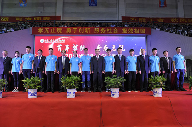 主席台的全体校领导,为新生代表佩戴校徽,通过校徽佩戴仪式将南工院人的使命和责任赋予全体新生。
