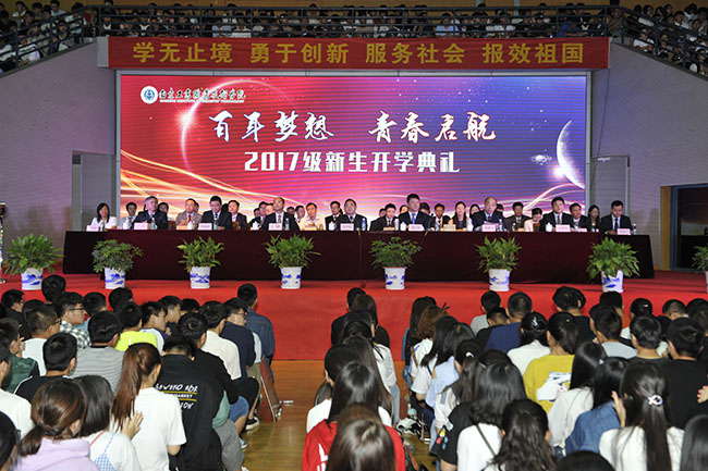 9月20日上午,南京工业职业技术学院2017级新生开学典礼在仙林校区体育馆隆重举行。学校党委书记吴学敏,党委副书记、校长谢永华,党委委员、纪委书记于林惠,党委委员、副校长霍雄飞、朱建国、崔新明,总督学卢兵出席开学典礼,各职能部门、各二级单位党政主要负责人、辅导员、新生班主任以及4670余名新生和留学生代表参加了开学典礼。典礼由党委委员、副校长霍雄飞教授主持。