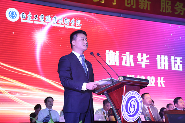 校长谢永华教授发表了题为“以梦为马,不负韶华,遇见更好的自己”的讲话。他代表学校向2017级全体新同学表示热烈的祝贺,从“有一个‘高端大气、璀璨辉煌’的百年历史”、“有一批‘爱生如子、爱岗敬业’的教师楷模”、“有一群‘奋发进取、追求卓越’的学生榜样”三个方面介绍了学校悠久办学历史,爱岗敬业的教师楷模和奋发进取的学生榜样,带领全场同学一起感受南工院的荣耀。他深情地寄语同学们“你今天的努力,就是要让未来的你感谢现在的自己!你们在最美好的青春年华,与南工院相遇,立志从这里出发,多年以后,你们会发现今天的相遇,是人生中的一场最美丽的‘遇见’”。他现场送给同学们“适时地清空自己”、“换个角度看世界”、“迈开创新的脚步”三句话,希望同学们“保持学习者心态、不要停下脚步”、“积极面对挫折、不要轻言放弃”、“要敢为人先、不要墨守成规”,在创新创业中增长智慧才干,努力成为服务人民、建设美好富强国家的奋进者、开拓者和奉献者。最后,谢校长与在场同学分享了自己很喜欢的一句话,“If not now,when?Ifnot me,Who?”,并解读了这句话的内涵“此时无为,更待何时;我不挺身,更待何人”,勉励全体同学珍惜美好年华,活出灿烂人生!