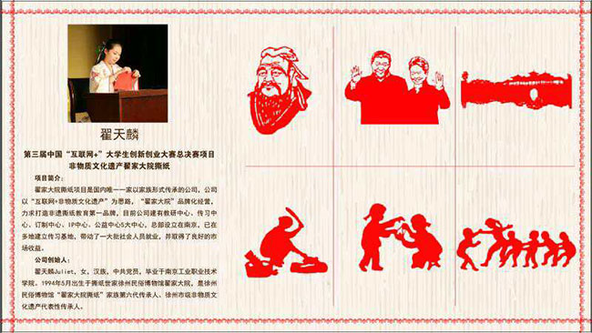 翟天麟是具有400多年历史的“翟家大院撕纸”家族第六代传承人和非物质文化遗产代表性传承人,她自幼学习撕纸。在我校读书期间,她创办了南京翟家大院文化有限公司。翟天麟将绝学撕纸作为创业项目,通过培训教育方式开发撕纸教育产品,培育撕纸市场,创建撕纸教育认证品牌,以品牌加盟促进就业创业,在保持传统特色的基础上利用“互联网+”,打造了非遗撕纸教育第一品牌。该项目团队能够取得如此骄人的成绩,得益于我校厚植的创新创业沃土。作为国务院“第二批大众创业万众创新示范基地”的院校和教育部“创新创业教育改革示范校”,我校以大赛作为推动创新创业教育改革与发展的突破口,将学生创新精神、创业意识和创新创业能力培养列为人才培养的重中之重,将创新创业教育贯穿到思想政治教育、校企合作、科技创新、师资建设、国际交流等学校工作的各个方面,实现了“创新引领创业、创业带动就业”的良性发展,培养了一大批兼具创新创业能力和专业素养的高素质双创型技术技能人才。
