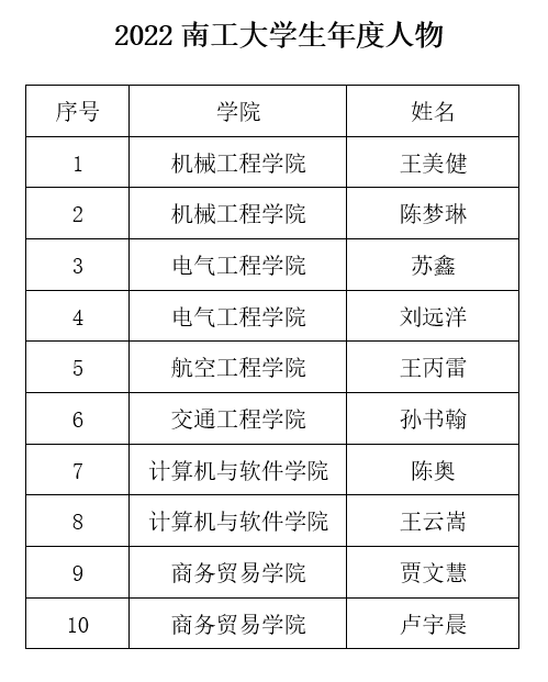 经个人申报、学院推荐、学校评审,确定以下10名同学为“2022年南工大学生年度人物”拟推荐人选。
