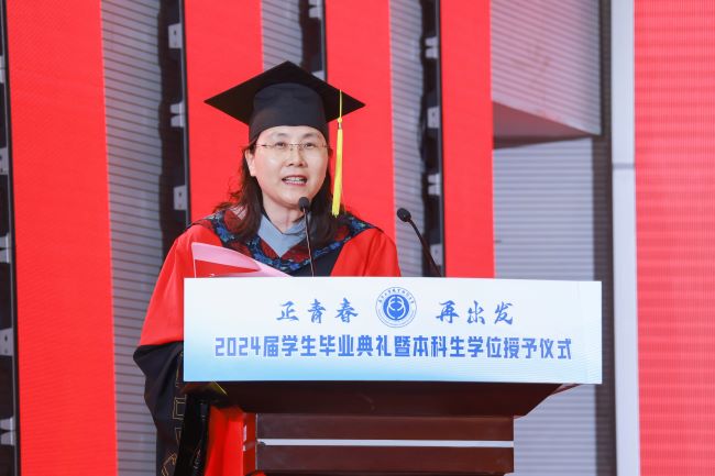 魏萍在主持典礼时祝贺2024届学子们顺利毕业,希望同学们能够在时代浪潮中找寻到自己的人生坐标,沉下心、俯下身,用心用情践行中国精神,感应时代脉搏,努力创造无悔的青春业绩。